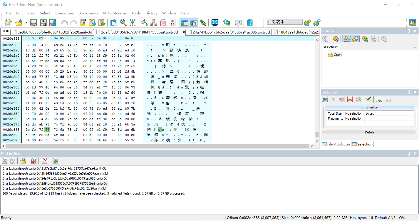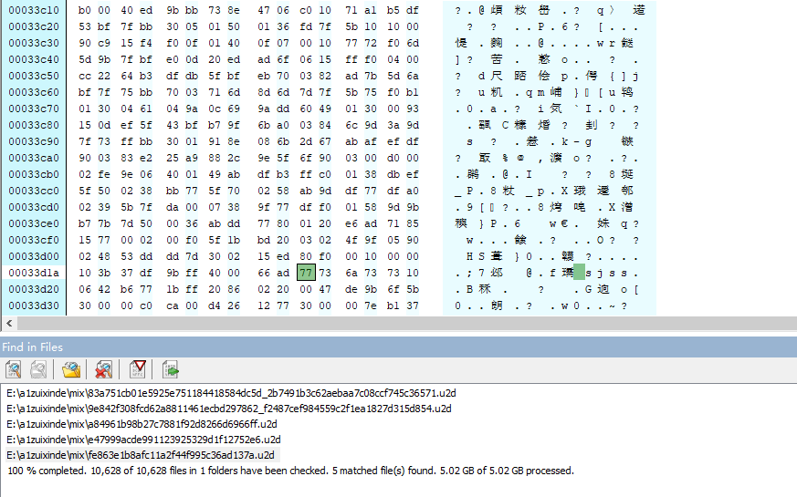 先用AssetStudio中的 File - Extract folder,将所有unity3d文件解压后再用16进制编辑器搜索
