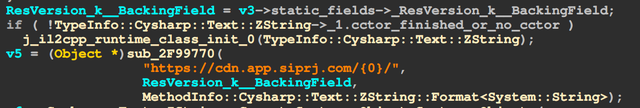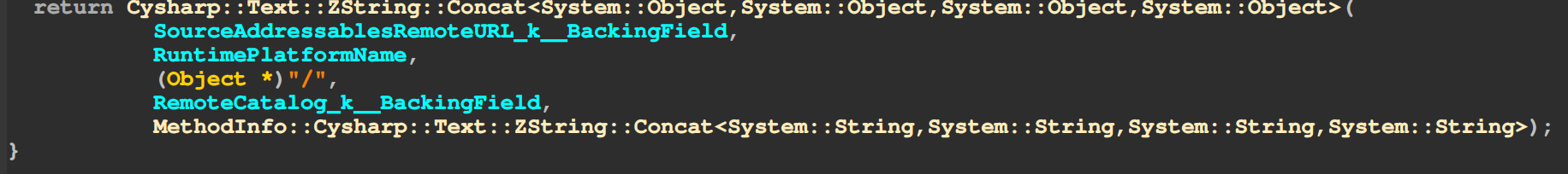 Polaris::Environment::get_RemoteCatalogURL返回值是SourceAddressablesRemoteURL_k__BackingField + RuntimePlatformName + / + RemoteCatalog_k__BackingField拼成的,所以能知道抓包的catalog是这么拼的: