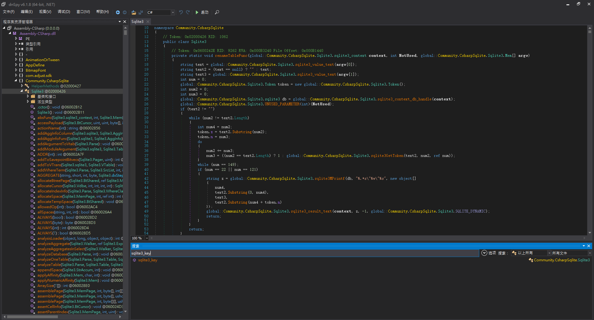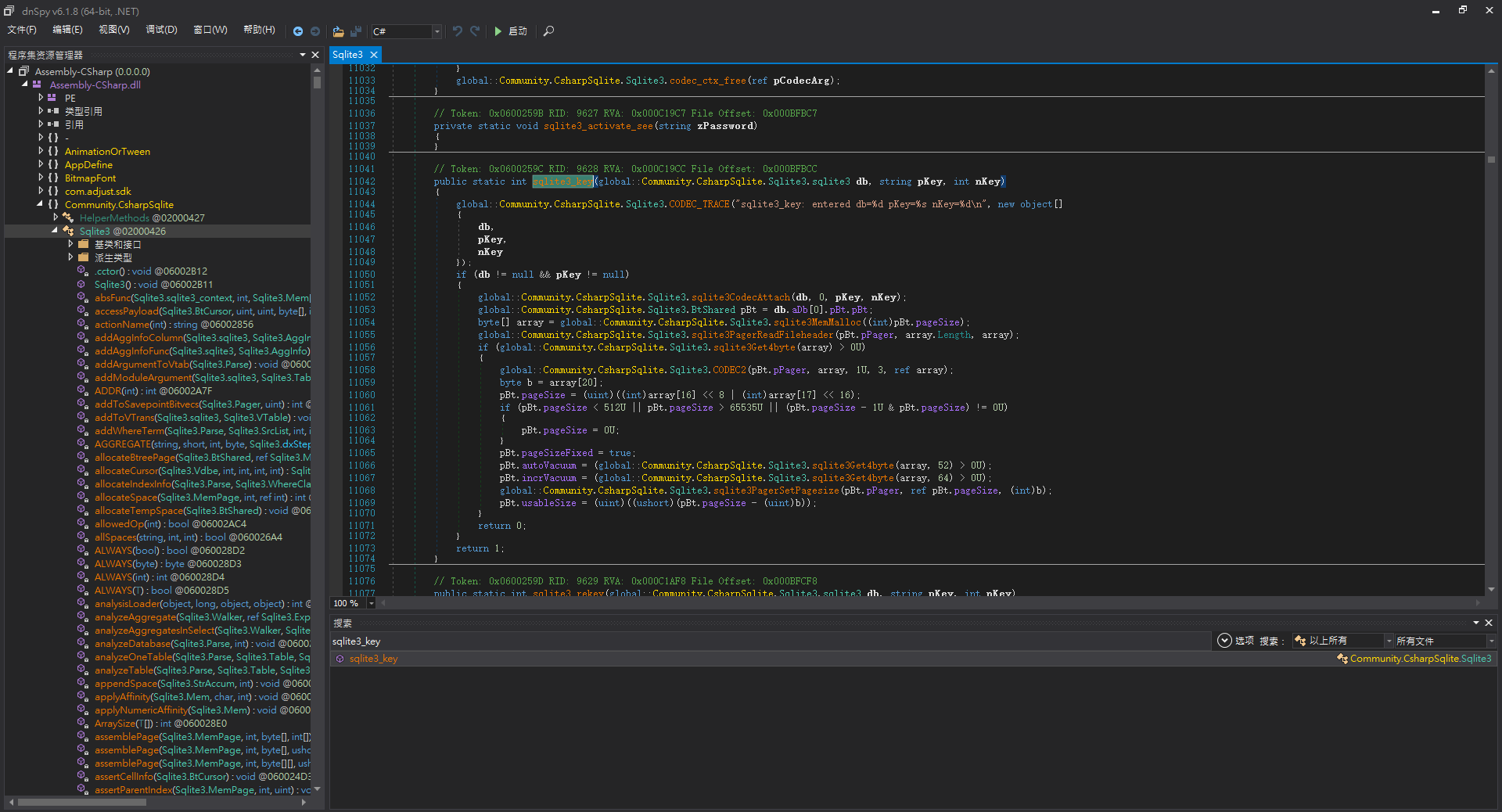 sqlite的key是 P97V23NO,不过他用的是 Community::CsharpSqlite ,感兴趣的话自己研究下实现来解密吧。
