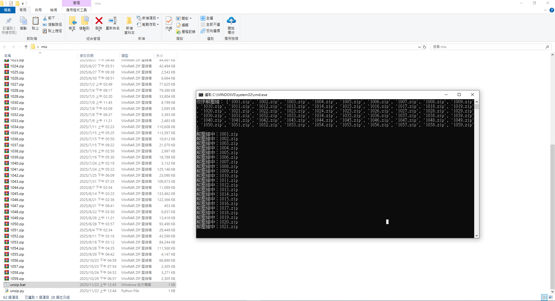 從1001.zip 到 1059.zip開始自動解壓縮