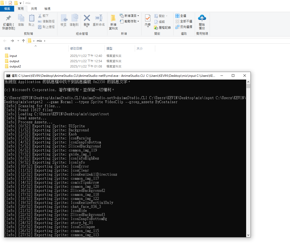 CMD命令 : AnimeStudio.CLI C:\Users\KEVIN\Desktop\mix\input C:\Users\KEVIN\Desktop\mix\output2 --game Normal --types Sprite --group_assets ByContainer