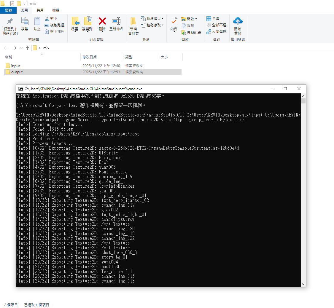 CMD命令 : AnimeStudio.CLI C:\Users\KEVIN\Desktop\mix\input C:\Users\KEVIN\Desktop\mix\output --game Normal --types TextAsset Texture2D AudioClip --group_assets ByContainer