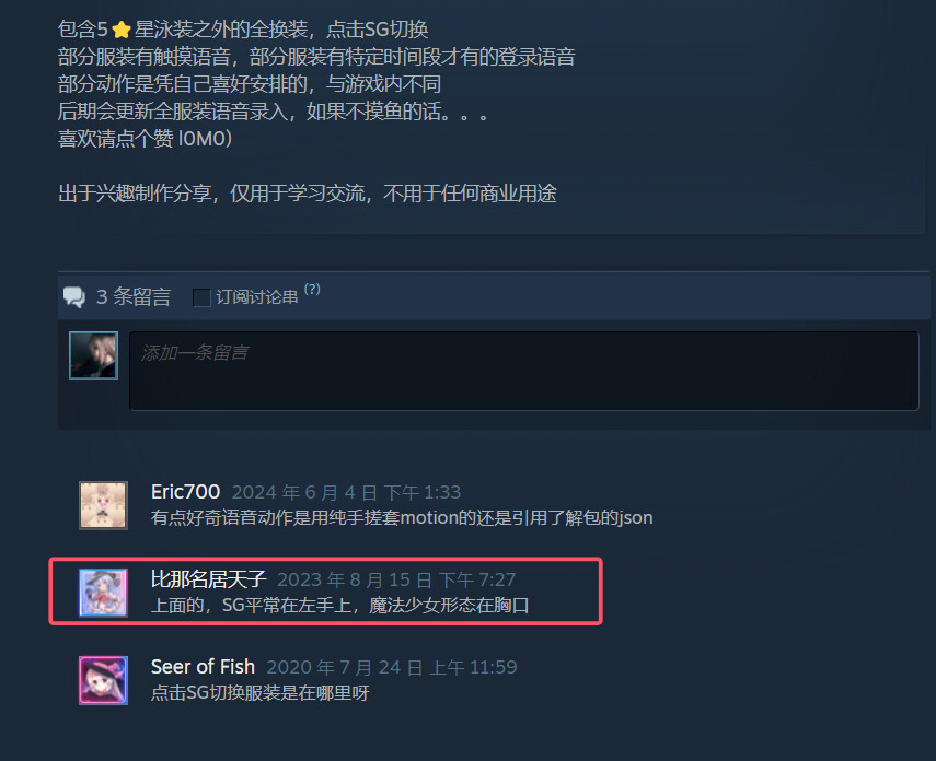 更新:楼主去找了其他的l2dviewer的魔纪的创意工坊,其中多数均提示SG可以切换服装但是实测并没有任何一个成功(无论是默认战斗服点胸口的宝石还是默认常服点手上戒指),恳请各位朋友指教一下是否是我的软件设置有误