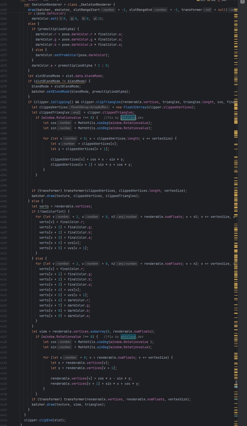 顺带一提你可以在SkeletonRenderer.ts添加一个二维坐标旋转功能