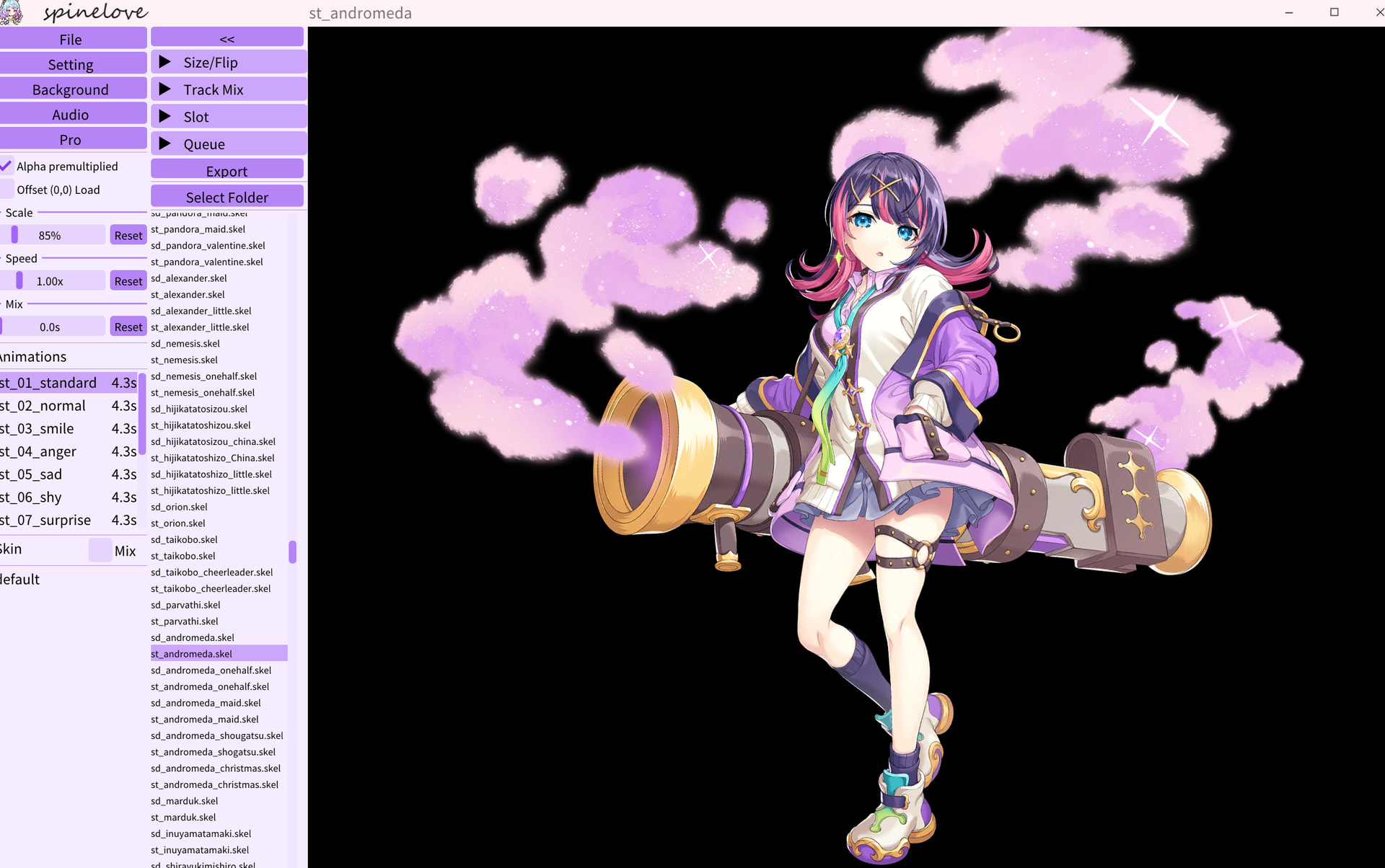 很感谢制作这个项目!这个viewer已经包含了绝大多数功能,非常有用,另外有几个拙见或许可以在后期的更新计划中参考,首先缩放、速度的数值调节可以添加文本输入,拉进度条比较难以精确控制,其次软件可以添加画布功能或可手动输入更改显示区尺寸,方便控制导出视频或图片的尺寸,最后或许可以在导出功能栏设置增加选择指定文件夹导出,或者增加像专业spine一样的文件名+动画的导出名称规则等内容,感谢分享!